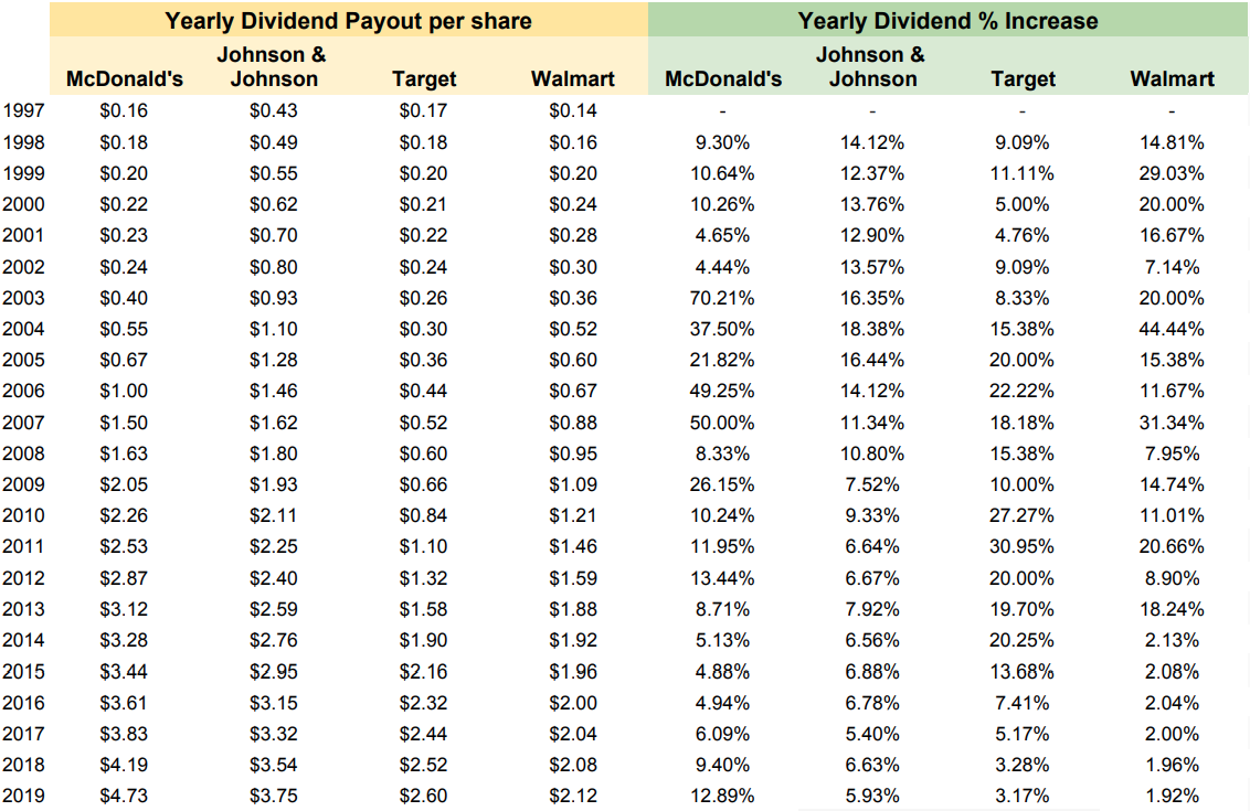 And here is the dividend payout history for some of the Dividend Aristocrat stocks: