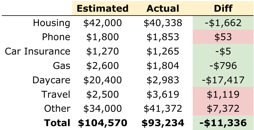 Daycare - we got lucky and underspent on daycare because my spouse stayed at home for most of the year. However, now that we are a dual-income family, we are actually building wealth faster now.