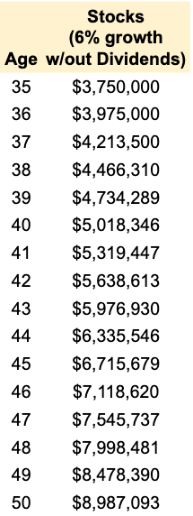 - Stocks will appreciate at a rate of 6% annually, not accounting for reinvested dividends or inflation. This is conservative because historically it has been 10% with dividends reinvested.