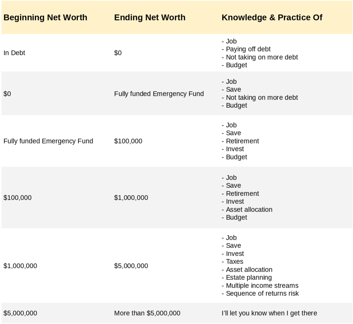 As you climb the net worth ladder, you should continue to expand your financial knowledge. The things you did that got you from $0 to $50,000 in net worth will most likely not get you from $50,000 to $500,000. And the things you did that got from you $50,000 to $500,000 will most likely not get you from $500,000 to $5,000,000. Here’s a rough outline of what people should learn/care about as they climb the net worth ladder.