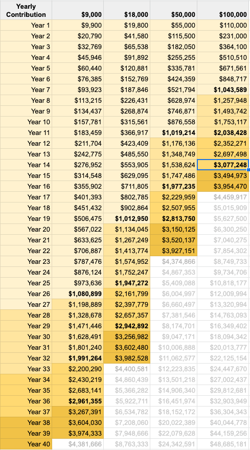 As seen in Figure 1.1, if one were to contribute $9,000/year they will reach $100,000 in networth after ~7.5 years. And they will make their second $100,000 (that is from $100k to $200k) in only ~4 years after that…the third $100,000 in 3 years after that…and the tenth $100,000 in less than 1 year!
