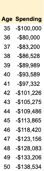 Other than the 1st year, the yearly dividends will be enough to cover the spending column. The difference between dividend payout and spending in the 1st year will be covered with cash.